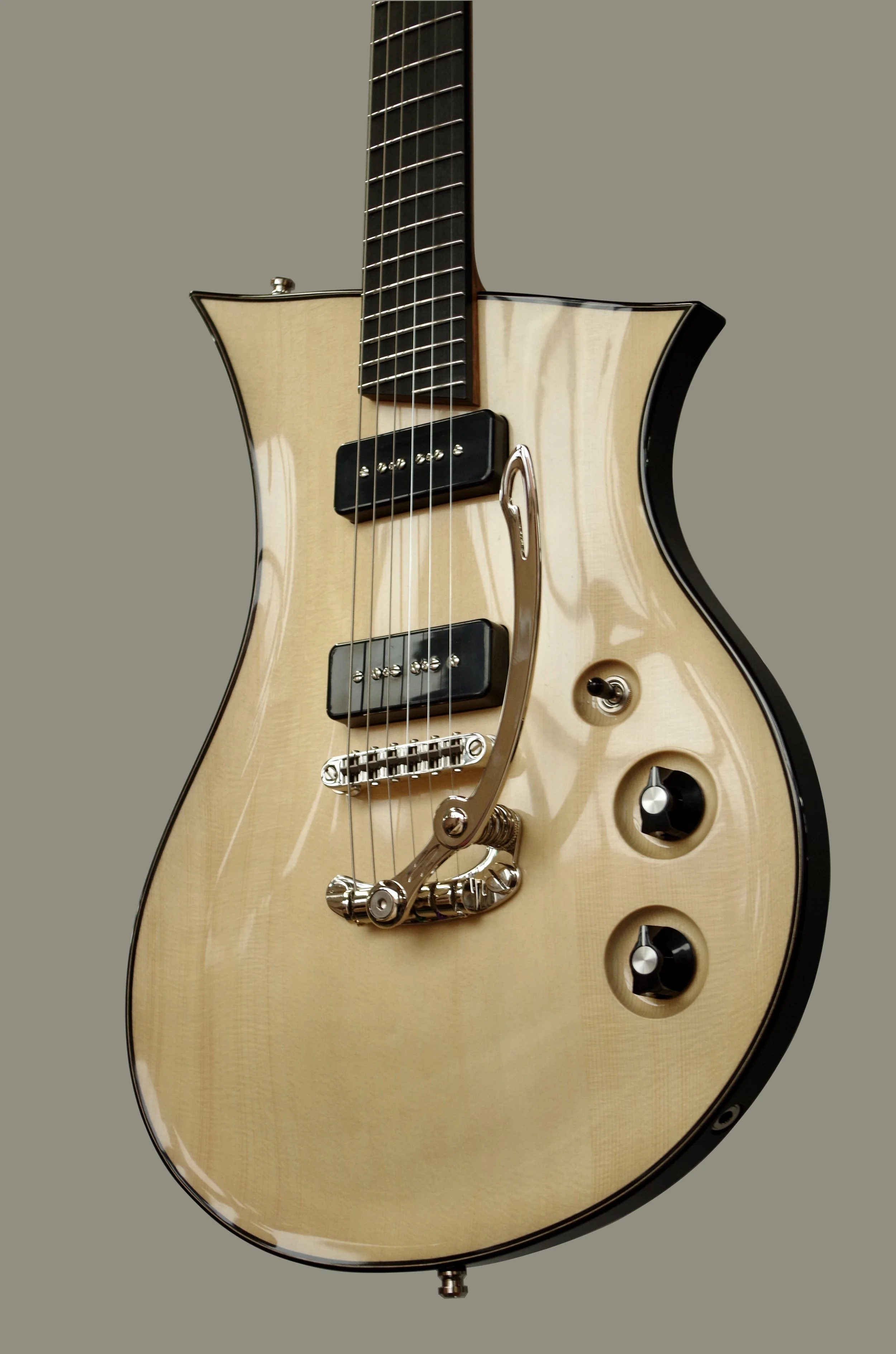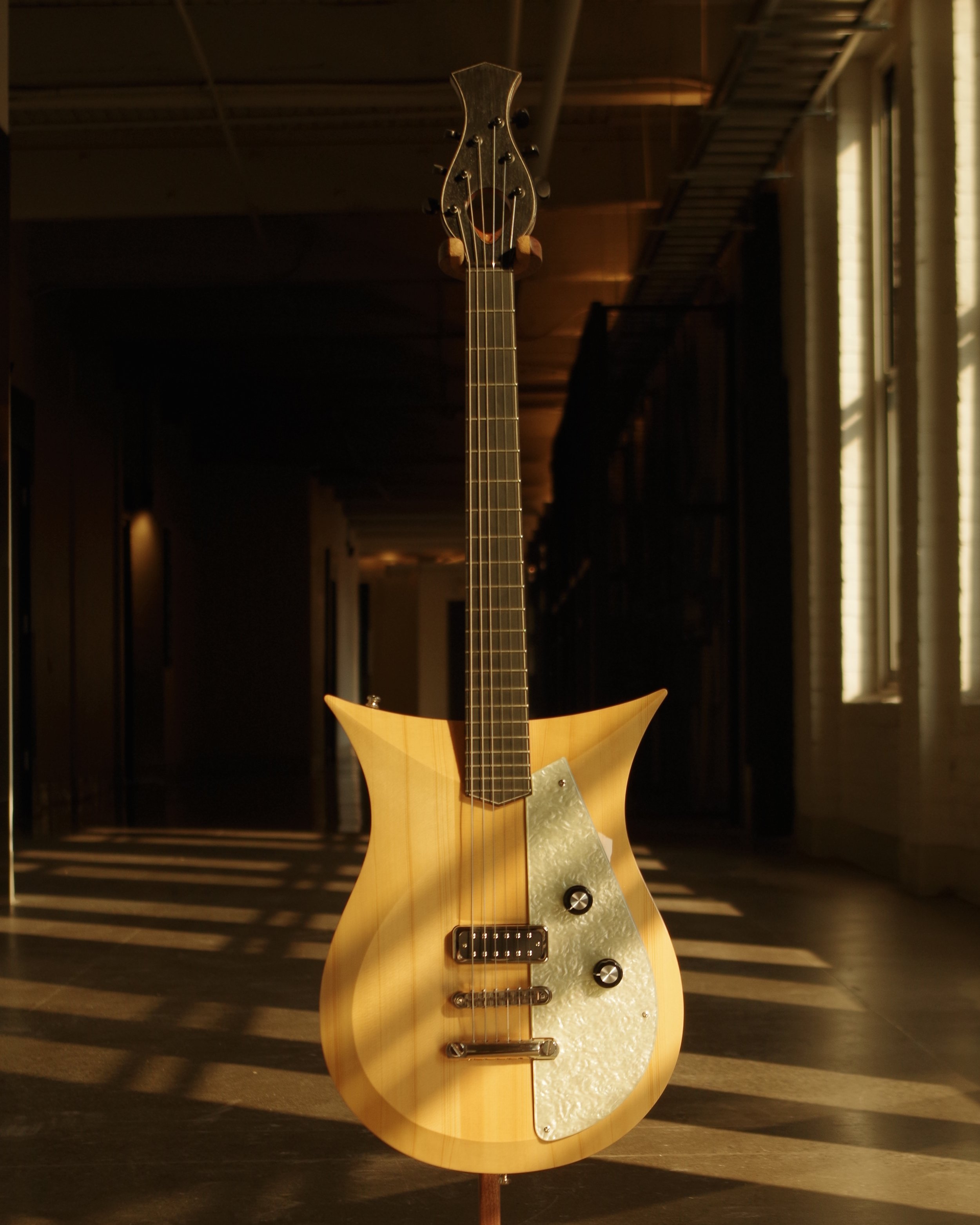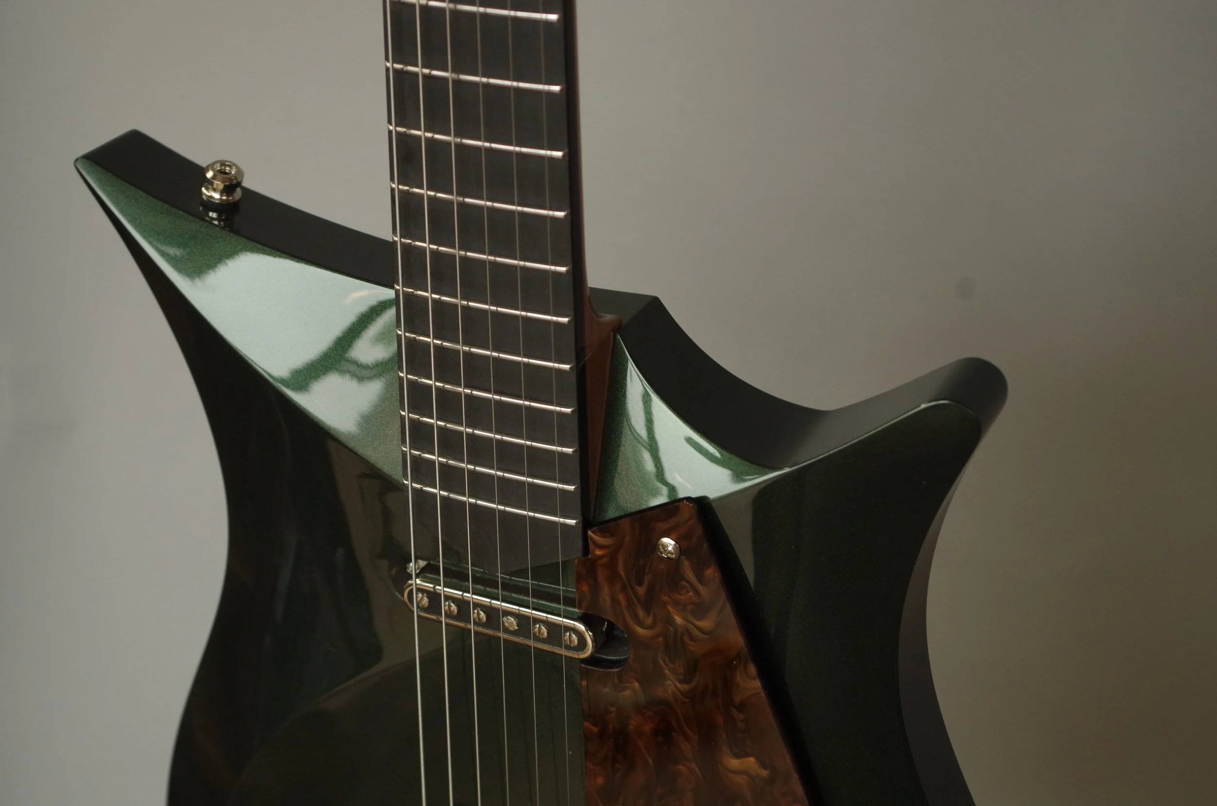 After graduating, William founded Senez Guitars, determined to move beyond the acoustic tradition toward a new expression in electric guitar making — one shaped by architecture, sculpture, and decorative art. His 2021 creation, the Psari, embodies this philosophy, merging Art Nouveau influences with daring, contemporary form.