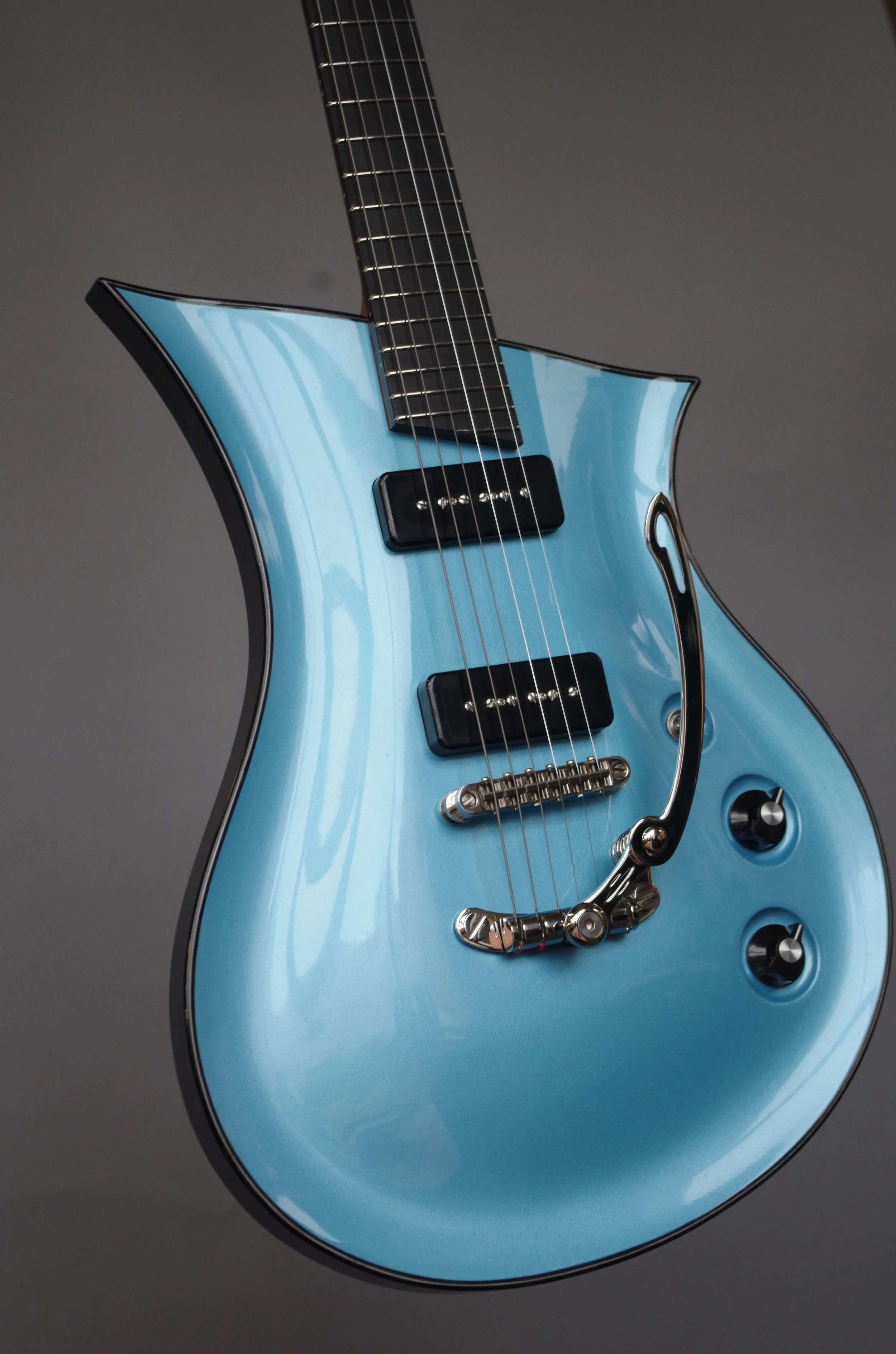 Discover the Senez Guitars Ogive-C in Cosmic Blue — a boutique electric guitar handcrafted in Montreal. Built from quartersawn Engelmann spruce with a black walnut neck, the Ogive-C delivers clarity, warmth, and dynamic response across clean, fuzzy, and ambient tones.