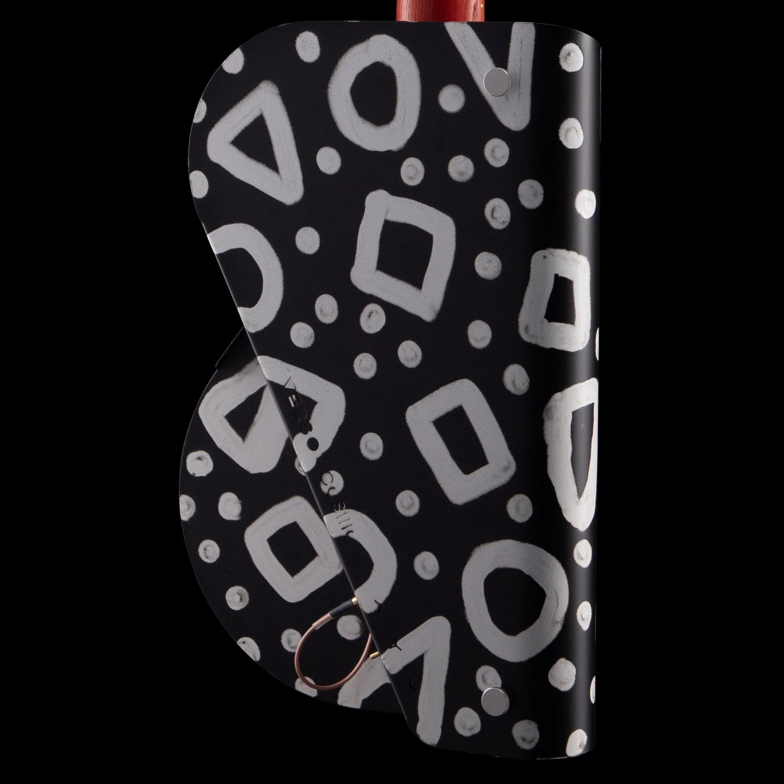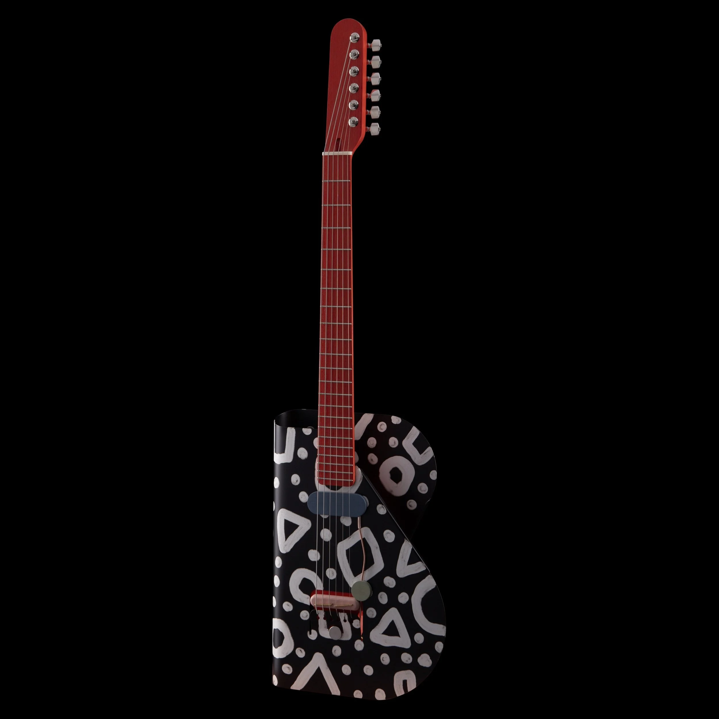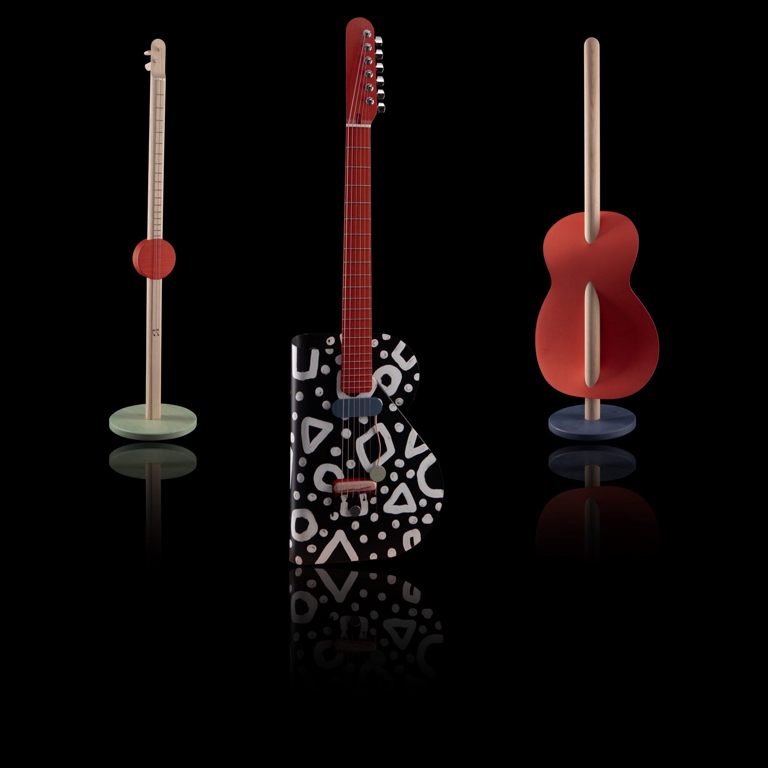 artistic way. It features a fully working two-string batten e-guitar (right), a textile-body pictogramm sculpture (left), and the center piece the Cosmo — hand-painted by Las Vegas based artist Pretty Done. By partially removing the powder coating with a vacuum, he created a bold pattern before it is permanently baked in. This pattern intentionally disrupts the guitar’s clean shape, creating a tension of more & less.