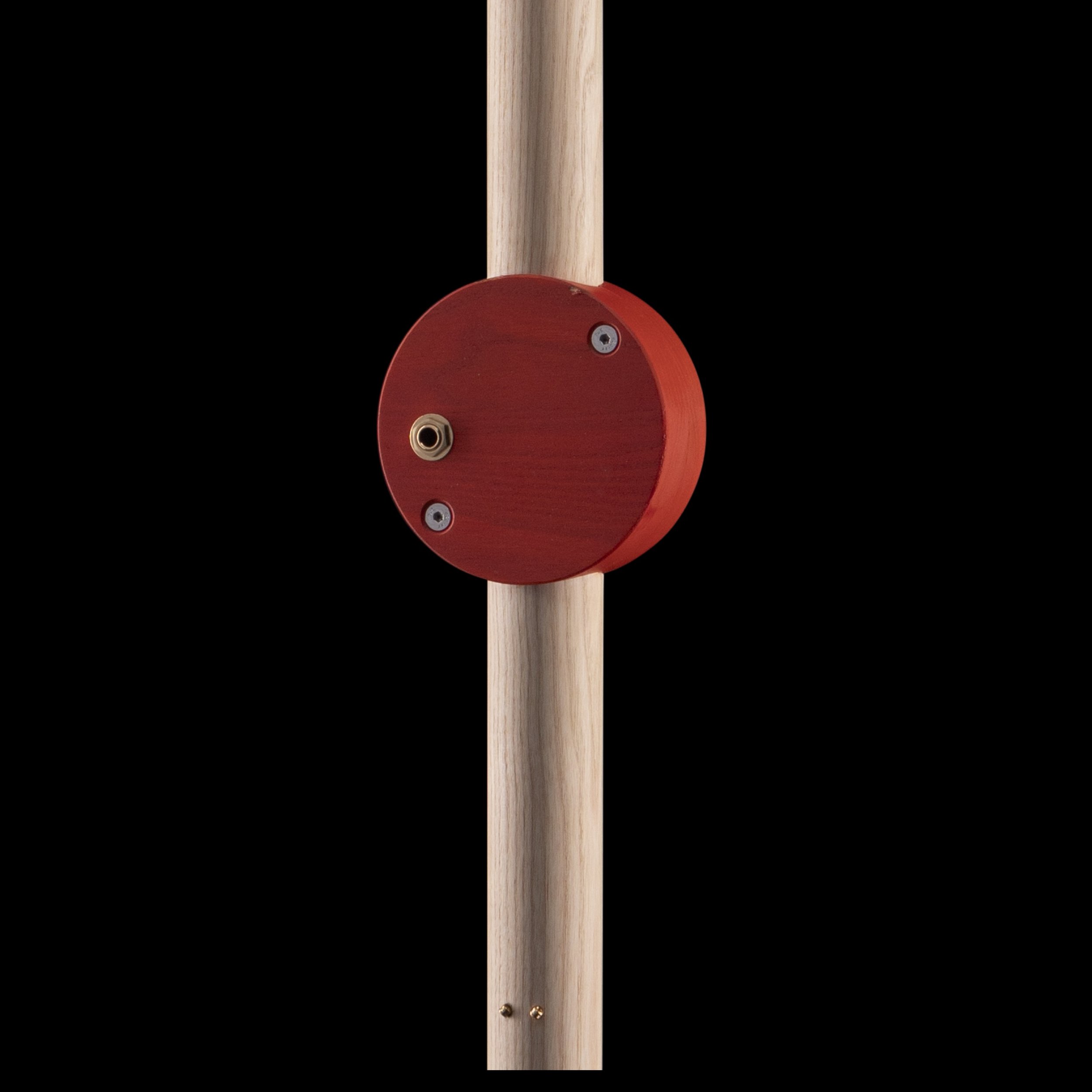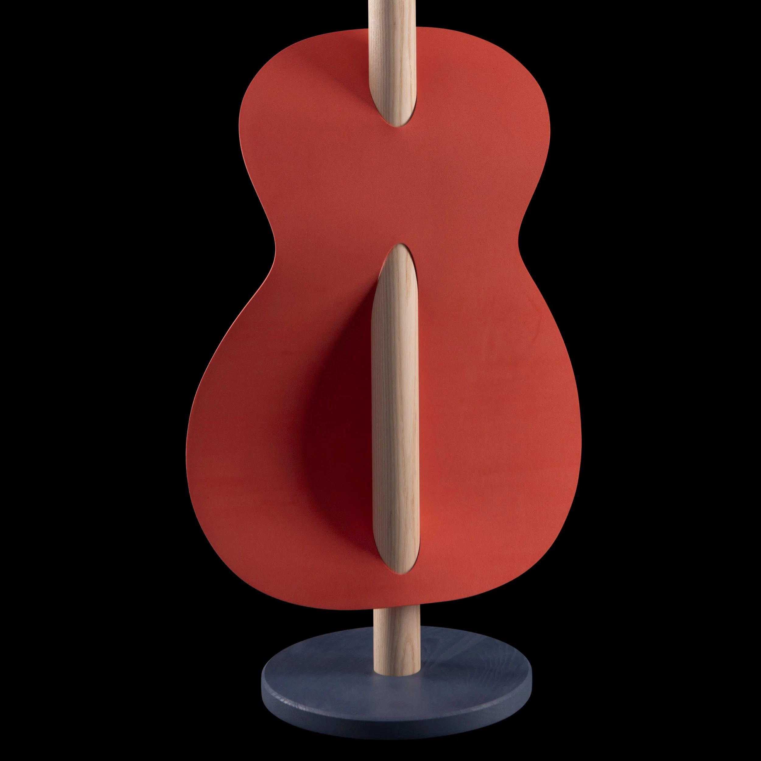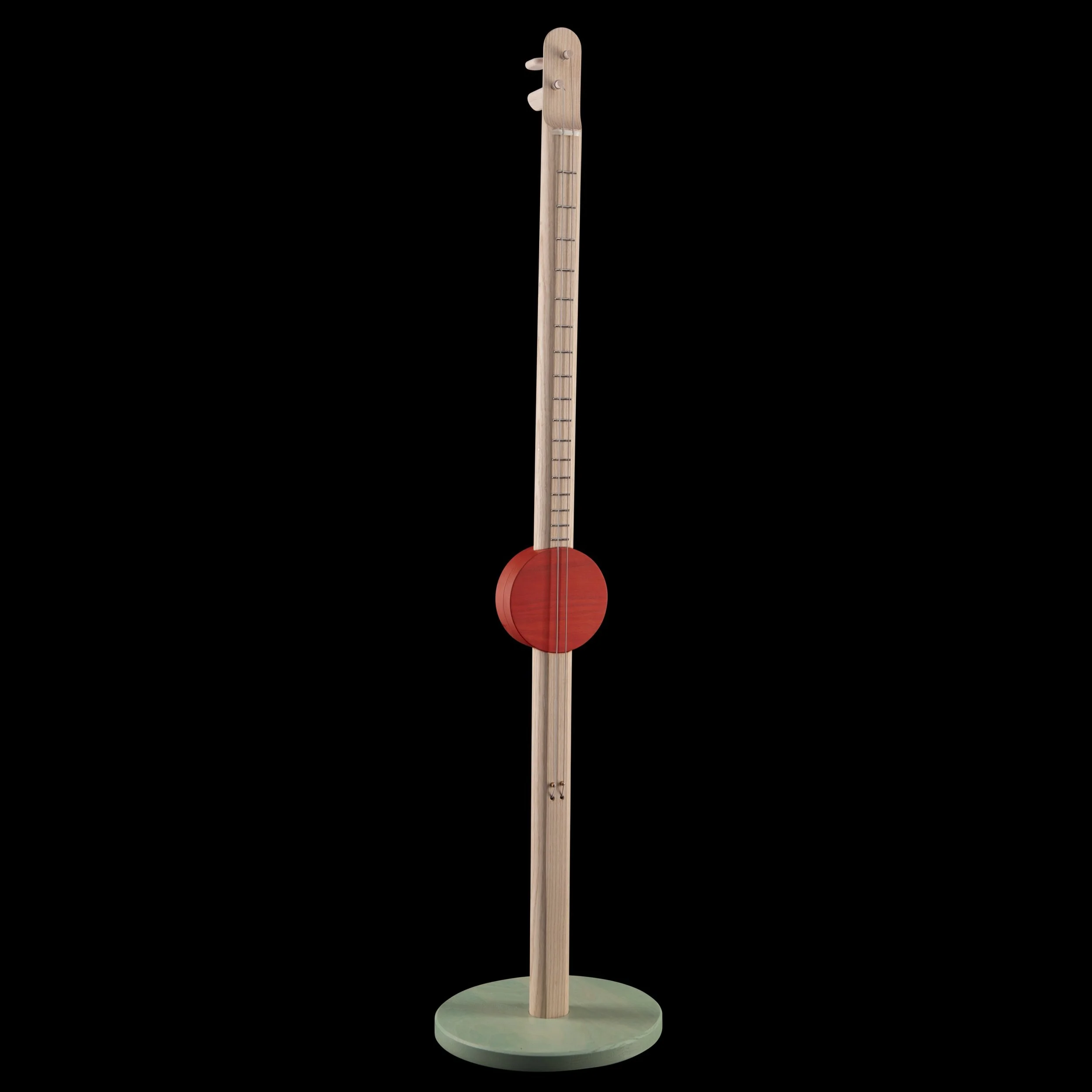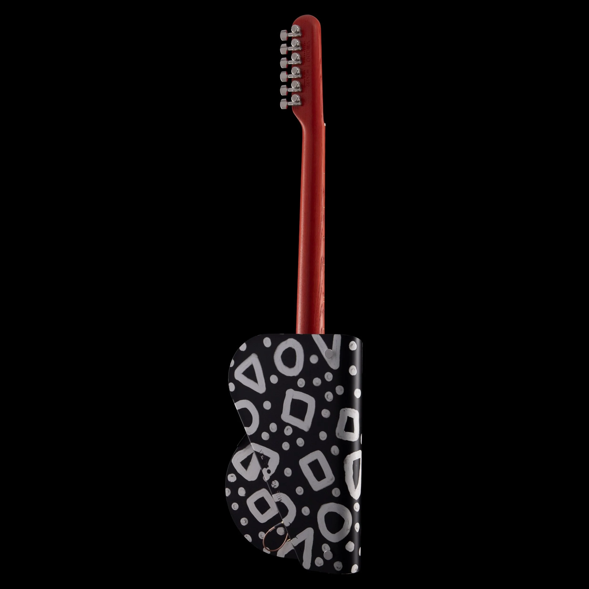 artistic way. It features a fully working two-string batten e-guitar (right), a textile-body pictogramm sculpture (left), and the center piece the Cosmo — hand-painted by Las Vegas based artist Pretty Done. By partially removing the powder coating with a vacuum, he created a bold pattern before it is permanently baked in. This pattern intentionally disrupts the guitar’s clean shape, creating a tension of more & less.